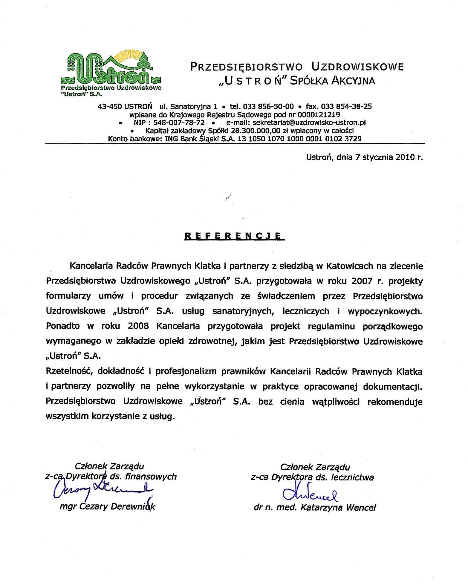 Kancelaria Radców Prawnych Klatka i partnerzy z siedzibą w Katowicach na zlecenie Przedsiębiorstwa Uzdrowiskowego„Ustroń” S.A. przygotowała w roku 2007 r. projekty formularzy umów i procedur związanych ze świadczeniem przez Przedsiębiorstwo Uzdrowiskowe„Ustroń” S.A. usług sanatoryjnych, leczniczych i wypoczynkowych. Ponadto w roku 2008 Kancelaria Przygotowała projekt regulaminu porządkowego wymaganego w zakładzie opieki zdrowotnej, jakim jest Przedsiębiorstwo Uzdrowiskowe„Ustroń” S.A. Rzetelność, dokładność i profesjonalizm prawników Kancelarii Radców Prawnych Klatka i partnerzy pozwoliły na pełne wykorzystanie w praktyce opracowanej dokumentacji. Przedsiębiorstwo Uzdrowiskowe„Ustroń” S.A. bez cienia wątpliwości rekomenduje wszystkim korzystanie z usług ...